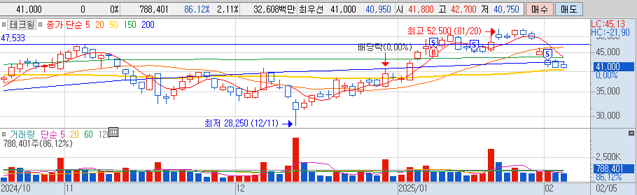 4. 테크윙 1/8 (추추) - 47500 매수 --> 1/8 흔들기에 반절 손절 후 재 매수 --> 1/15 반절 손절 --> 2/3 잔량 손절