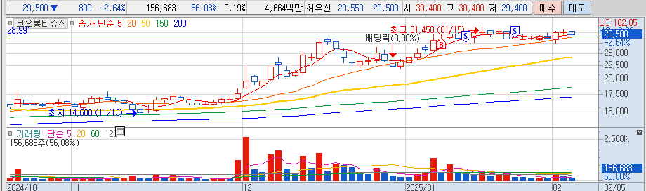 3. 코오롱티슈진 1/8 (추추) - 28550 매수 --> 1/13 반절 손절, 1/21 남은 잔량 본전 짜름 (3만원 돌파 이후 되돌림하면서 지지 부진하다 판단하여 짜름)