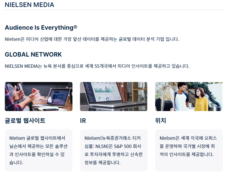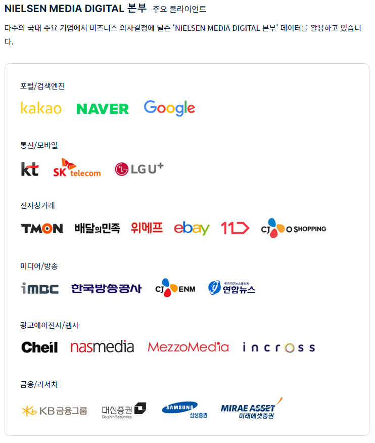 일단 닐슨이라는 이름은 어딘선가 줏어들었던 기억이 있는데, 홈페이지를 둘러보니 미디어 산업 관련해서 많은 데이터를 수집 및 분석을 통해 국내외 업체에 인사이트를 제공해주는게 주 목적인 회사인것 같다.