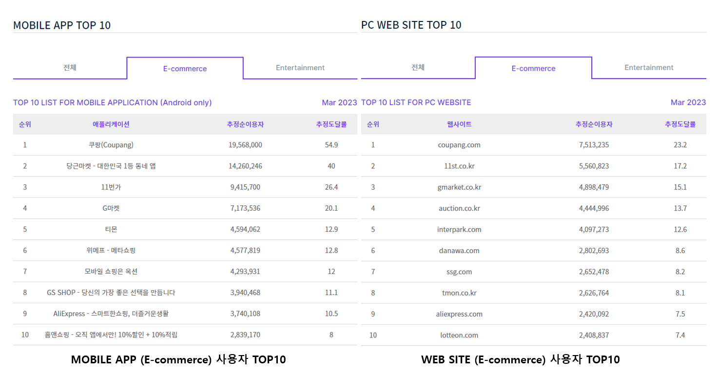 일단 모바일은 쿠팡 --> 당근 --> 11st --> G마켓 순이었고 Web site로는 쿠팡 --> 11st --> gmarket --> 옥션 순인데 당근마켓이 web으로 사용하기에는 지역 등에 한계가 있어서 당근마켓을 제외하면 1~3위는 동일 하다고 봐야 겠다.